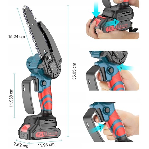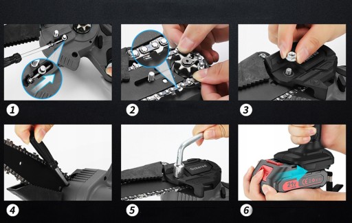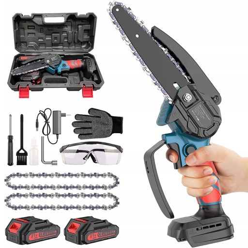 - Współpracują: 1 x 6-calowa mini piła łańcuchowa; 2 x bateria litowa 21 V; 1 x ładowarka; 2 x wysokiej jakości łańcuchy (zainstalowane); Śrubokręt; 1 x klucz; 1 x pusta butelka oleju; 1 x szczotka do czyszczenia;