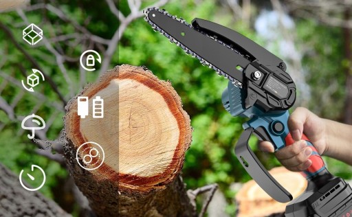 - Ta piła łańcuchowa jest wyposażona w 2 baterie litowe 21 V 2000 mAh, które można odłączać i samodzielnie. Zabezpieczenie przed obciążeniem i funkcjami kontroli obciążenia zabezpieczającego.