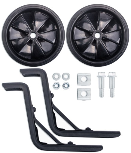 W zestawie znajdują się 2 kółka boczne, 2 ramiona oraz śruby montażowe, co oznacza, że masz wszystko, czego potrzebujesz do szybkiego i łatwego zamontowania kółek na rowerze dziecięcym.