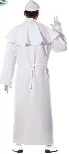 Kostium zawiera długą białą sutannę, pelerynkę,