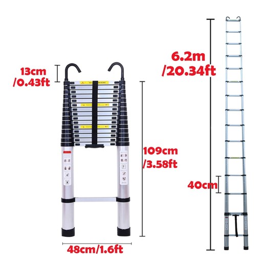 3. Wielofunkcyjny - pełna długość 6,2 m pozwala użytkownikom dotrzeć do wysokich miejsc, może to być drabina strychowa, drabina domowa, drabina biurowa. Idealny do prac domowych i zajęć na świeżym powietrzu, takich jak naprawa lamp sufitowych, wieszanie ramek do obrazów lub malowanie ścian, mycie okien, wymiana żarówki, prace ogrodowe, dostęp do strychu i wiele innych.