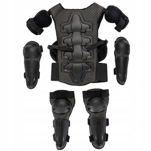 Materiał: siatka nylonowa EVA PP Dane techniczne: jeden rozmiar Rodzaj produktu: zbroja motocyklowa Klasyfikacja stylu: kask na całą twarz Pancerz zawiera jeden wierzchołek zbroi z naramiennikami oraz cztery zestawy ochraniaczy na kolana i łokcie. Waga: 0,82 kg, zestaw zbroi dla dzieci w wieku od 5 do 12 lat Rozmiar: wszystkie rozmiary Kolor: cały czarny Kamizelka pancerna: 43 cm * 33 cm, ochraniacz kolana: 31 cm * 15 cm, ochraniacz łokcia: 26.5*10 cm