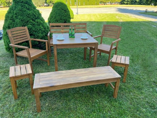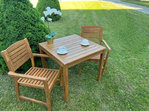 Wykonane z drewna akacjowego „neutralnego pod względem emisji dwutlenku węgla”, w komplecie z czerwonymi poduszkami na siedzisko.