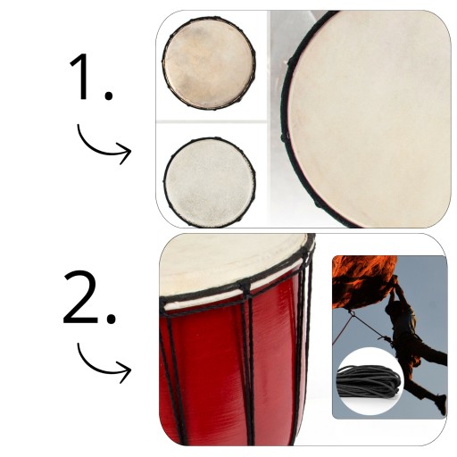 ♫ W tradycyjnym djembe napięcie membrany uzyskuje się dzięki mocnemu splotowi sznurka. Cienka kozia skóra pozwala na uzyskanie wysokich dźwięków uderzeń, ale po długim czasie użytkowania może się rozciągnąć – wtedy możemy nastroić bębenek, czyli zwiększyć napięcie jego membrany. Strojenie odbywa się poprzez przeplatanie linki pomiędzy pionowymi linkami trzymającymi membranę, co zwiększa ich napięcie, a także napięcie samej membrany. Należy pilnować, aby membrana była napięta równomiernie – wtedy dźwięk instrumentu pozostanie głośny i czysty.