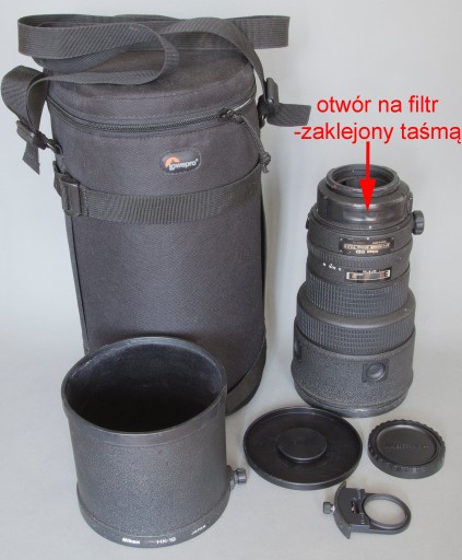 Sprzedaję legendarny, ultra jasny obiektyw Nikon Nikkor AF-I 300mm/2,8 adaptowany do aparatów Mamiya 645-Phase One tylko do modeli autofocus! Nie wiem czy obiektyw można zamocować w korpusie Phase One XF. Obiektyw nie pasuje do manualnych Mamiyi. W internecie jest dostępnych wiele różnych adapterów z mocowania Mamiya 645 na mocowania: Fuji GFX, Canon, Nikon, Sony i wiele innych. Obiektyw kryje całą klatkę 6x4,5cm bez winiety, z bardzo dobrą ostrością i kontrastem od rogu do rogu kadru. Konstrukcja optyczna obiektywu nie jest zmodyfikowana. Bardzo dobry stan wizualny i optyczny. Trochę lekkich otarć na obudowie obiektywu, patrz zdjęcia. Idealny stan optyczny! Nie ma żadnych rysek na soczewkach. Nie ma też w obiektywie zamgleń, grzyba czy separacji. Kilka pyłków kurzu na wewnętrznych soczewkach. Nastawianie ostrości pracuje tylko manualnie, zakres ostrości: od 2,5m do nieskończoności. Z obiektywu został wyjęty filtr, ponieważ lekko winietował na formacie 4,5x6cm. Otwór na filtr został zaklejony czarną taśmą i w każdej chwili taśma może być odklejona aby używać filtrów. Przysłonę można przymykać palcem od tyłu obiektywu po wyjęciu obiektywu z aparatu. Obiektyw sprzedaję z oryginalną solidną, długą osłoną przeciwsłoneczną HK-19, z solidnym metalowym przednim dekielkiem, z plastikowym tylnym dekielkiem, z wsuwanym filtrem UV oraz z wysokiej klasy torbą-futerałem Lowepro. Aparat Mamiya 645 widoczny na zdjęciu nie jest przedmiotem tej aukcji. Gwarantuję bardzo solidne zapakowanie obiektywu w paczce.