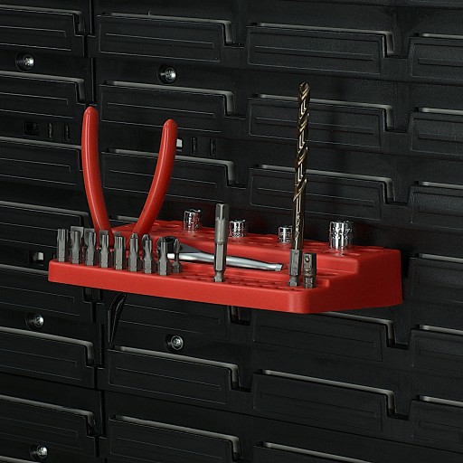 ⭐ Wytrzymała półka narzędziowa oraz uchwyty pomagają w przechowywaniu dłuższych narzędzi tj. wiertarka, klucze, młotek, kombinerki czy śrubokręty.