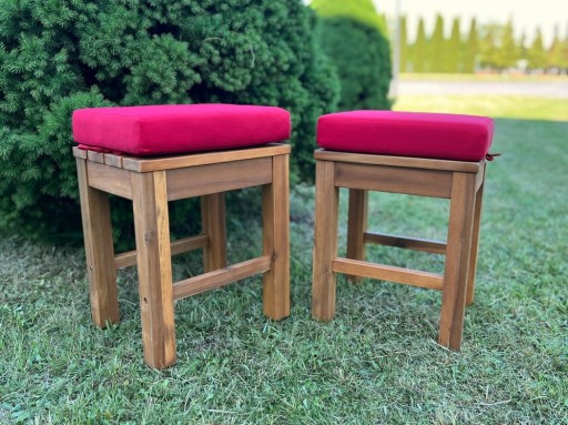 - Taborety Amazon Aware, odporne na warunki atmosferyczne i wodę, z certyfikatem FSC (FSC N004130) (zestaw 2 szt.); wykonane z litego drewna akacjowego w naturalnym wykończeniu, ze zdejmowanymi poduszkami siedzisk z tkaniny poliestrowej w kolorze czerwonym.