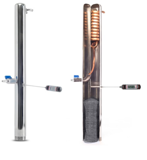 Nasza kolumna destylacyjna wypełniona jest miedzianą chłodnicą. To właśnie dzięki miedzianym chłodnicom powstaje najlepszy jakościowo destylat. Odbiór destylatu znajduje się w połowie wysokości kolumny, co przekłada się na lepsze oczyszczenie materiału. Kolumna posiada wkręcane złącze, dzięki czemu jest w pełni demontowana. Łatwa możliwość zmiany funkcji kolumny z rektyfikacyjnej na kolumnę Pot Still.