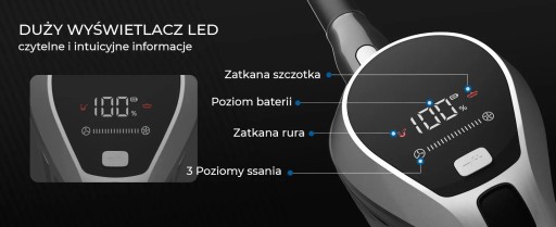 Bezprzewodowy odkurzacz Air Essence Bise PRO został wyposażony w innowacyjny, wszechstronny wyświetlacz LED, który umożliwia odczyt w czasie rzeczywistym: