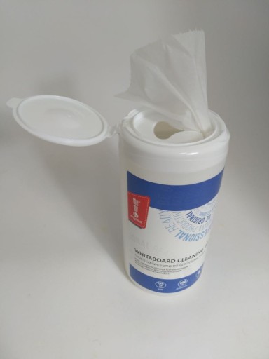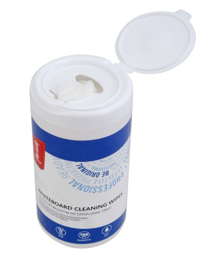 Antystatyczne chusteczki MemoBe nawilżone płynem o delikatnym zapachu, do usuwania śladów markerów suchościeralnych z tablic z powierzchnią lakierowaną.