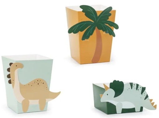 Pudełka na przekąski Dinozaury wykonane z papieru, mix kolorów. Zestaw zawiera 4 duże i 2 małe pudełka oraz 6 papierowych elementów. Wymiary po złożeniu małych ok. 10 x 10 x 5.5, dużych ok. 9.5 x 9.5 x 12 cm. Zestaw do samodzielnego złożenia.