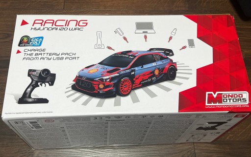 Samochód Hyundai i20 Coupe WRC w skali 1:10 zdalnie sterowany radiem. Zapewnia płynną kontrolę nad układem kierowniczym i przyspieszeniem.