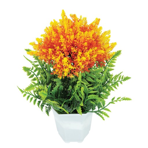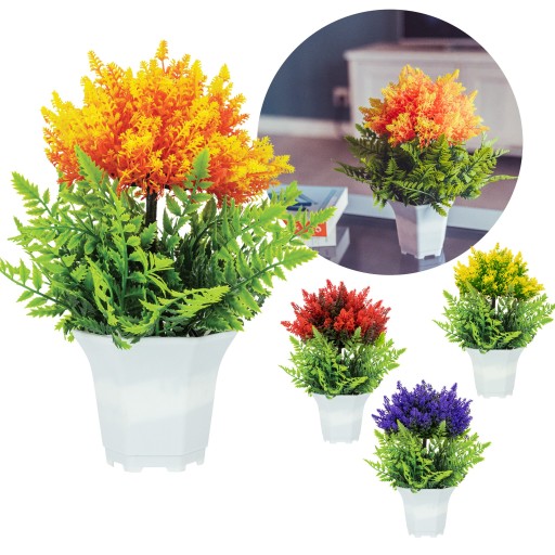 Doniczkowy kwiat idealnie odwzorowujący piękno żywego kwiatka. Dostępny w trzech żywych kolorach: fioletowym, czerwonym, pomarańczowym i żółtym. Łodygi wykonane z elastycznego tworzywa sztucznego umożliwiają łatwe formowanie i uzyskanie odpowiedniego efektu wizualnego. Jest to idealna roślina dla wystrojów, w których ciężko utrzymać świeże kwiaty. Kwiat umieszczony w białej doniczce plastikowej wypełnionej sztuczną trawą.