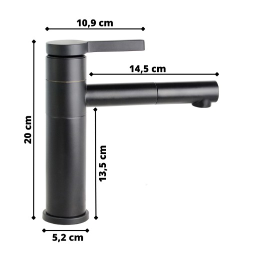 Bateria kranowa została wykonana z metalu pokrytego wysokiej jakości powłoką w kolorze czarny mat. Jest odporna na przebarwienia i zarysowania, łatwa w utrzymaniu czystości.