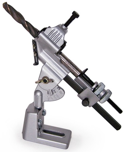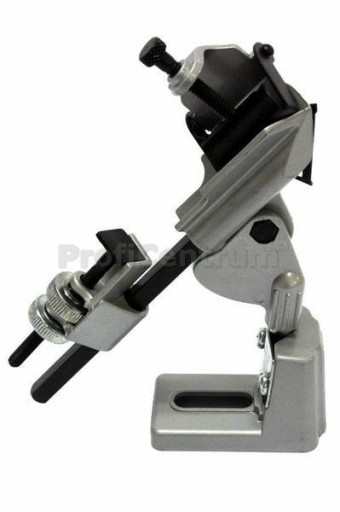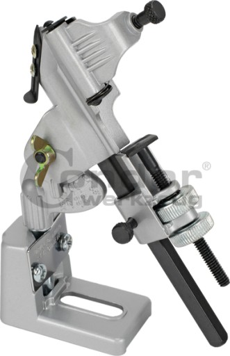 • 3. Urządzenie zamontować pionowo przed kamieniem do szlifowania (patrz szkic). Wiertło powinno być ustawione przy dolnej połowie kamienia z lewej lub prawej strony. (Uwaga: Urządzenie musi swobodnie być ruchome!) Podstawę A zamocować śrubą motylkową lub ściskiem, tak aby wiertło u góry miało ok. 5 mm odstępu od kamienia.
