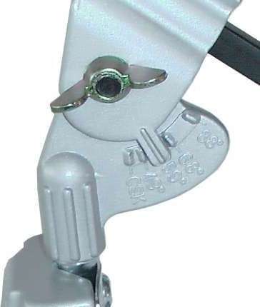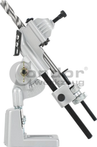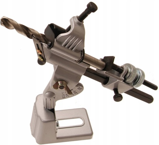 • 4. Śrubę zatrzymującą E wystarczająco poluzować, kamień szlifierski wprawić w rotację i za pomocą śruby D wiertło powoli przesuwać aby dotykało kamienia. Wówczas urządzenie odchylać na lewo i prawo (ok. 60°), wtedy automatycznie uzyska się odpowiedni kąt szlifowania. W zależności od tego jak głęboko ma być szlifowane wiertło śrubę D powoli w odstępach kręcić do przodu. Powoli. aby zapobiec przegrzaniu i spaleniu wiertła.