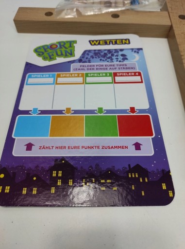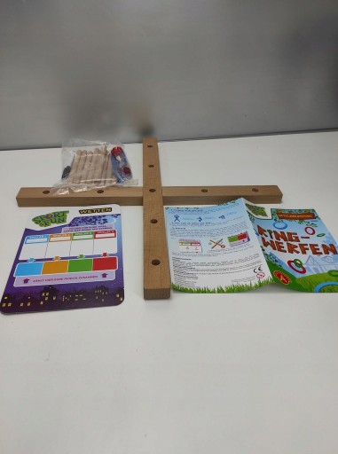 - W zewnętrznym zestawie znajduje się 1 drewniany krzyż o długości ok. 48 x 48 cm z 9 drewnianymi patyczkami o wymiarach ok. 16 cm, 2 kółka o średnicy 7 cm, 12,5 cm i 16,5 cm, 1 długopis, 1 klepsydra, 1 karta wyników i 1 linka do rzucania
