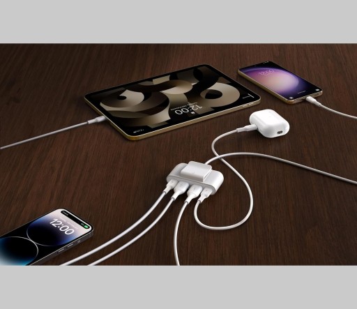 - Rozdzielacz mocy: umożliwia ładowanie 4 urządzeń jednocześnie na 1 porcie USB-C ładowarki