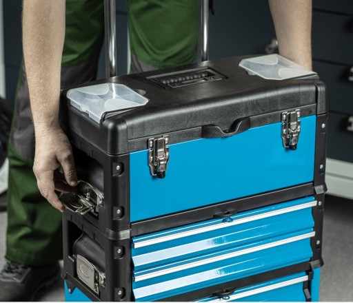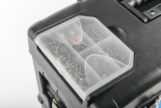 - Górna skrzynka o wymiarach 420 x 220 x 150 mm i nośności 20 kg z metalowymi zapięciami. W górnej pokrywie znajdują się 2 wyciągane organizery z przezroczystą pokrywą, każdy z 5 przegródkami do przechowywania małych części czy akcesoriów oraz tacka narzędziowa.