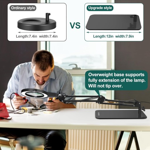 Duża podstawa i zacisk 2 w 1: Lampa powiększająca z obciążoną podstawą i zaciskiem typu C. Podstawę można wykorzystać jako lampę stołową lub przymocować metalowy zacisk do krawędzi płaskiej powierzchni (o grubości <65 mm) jako lampkę z klipsem. Zacisk można łatwo zamontować na stole, półce lub biurku bez użycia narzędzi. Uwolnij ręce, aby cieszyć się sztuką i hobby, takimi jak rękodzieło, biżuteria, malowanie, robienie na drutach, zdobienie paznokci, lutowanie itp.