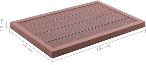 Element płyty ślizgowej podłogi prysznica wykonany jest z wysokiej jakości kompozytu drewna i tworzywa sztucznego (WPC), trwałego i trwałego, wytrzymuje trudne warunki pogodowe, idealnie nadaje się do użytku na zewnątrz. Całkowity element podłogowy ma wymiary 101 cm x 63 cmx 5,5 cm (dł. x szer. x wys.).