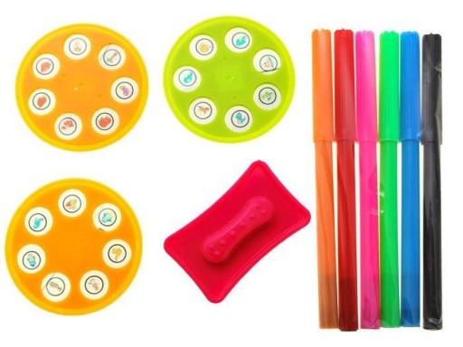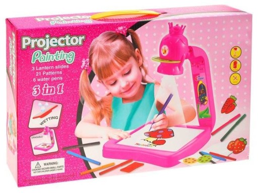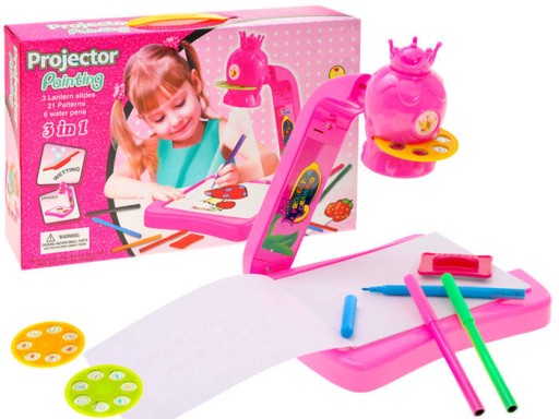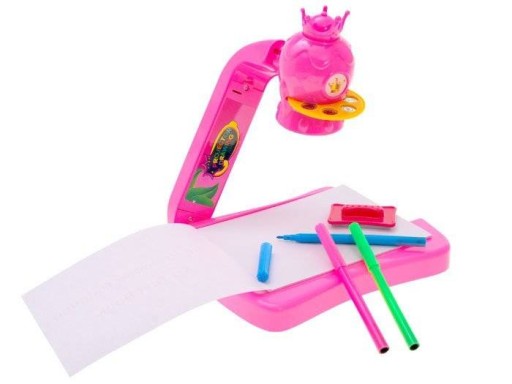 Fajna propozycja dla malucha lubiącego malować, rysować Tablica rzutnik z 3 kompletami wzorów do wyświetlania na tablicy, bądź ścianie, zapewne zainteresuje każdego małego artystę Rzutnik ma regulowane kąty nachylenia dlatego można go używać na samej tablicy jak i wyświetlać obrazki na ścianie Można go całkowicie złożyć i schować do szuflady-zajmuje niewiele miejsca po złożeniu Zastosowanie rzutnika jest szerokie, można wyświetlać obrazki typu (zwierzątka, samochodziki, różnego rodzaju posiłki…) na tablicy, ale i także na ścianie wieczorem Tablica bardzo ładnie wykonana sprawi wiele frajdy podczas zabawy Świetna zabawa zapewniona.Za pomocą rzutnika można- kopiować wyświetlane obrazki na kartce, przez co dziecko ćwiczy dłoń i rysunek,- wyświetlać można także obrazki na ścianie i tworzyć rózne opowiadaniaZestaw posiada- 6 mazaków- 3 komplety wzorów do rzutnika- zeszyt do malowania- tablica rzutnik- gąbka Obrazki załączone do rzutnika przedstawiają min.:- warzywa- zwierzątka- samochodyWymiary:- podstawa: 19 x 15 cm- pole do rysowania :15,5 x11,5 cm- wysokość ramienia rzutnika: 26 cm Zabawka zapakowana w kolorowe pudełko nadające się na prezent.