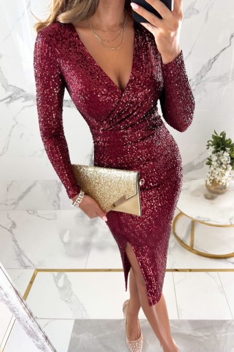 Piękna wyjątkowa sukienka maxi wykonana w całości z cekinów. Podszewka znajduje się korpusie do ud. Sukienka z tyłu posiada zamek. Rękawy są długie, lekko prześwitujące. Wyjątkowym walorem jest dekolt zakładany, pięknie eksponuje biust Z boku jest efektowne rozcięcie eksponujące nogi.