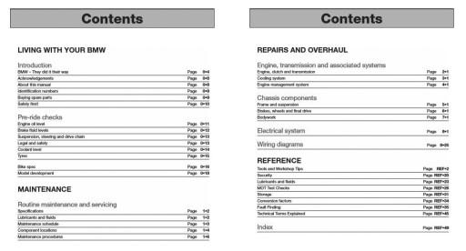 Zawartość typowego informatora wydawnictwa Haynes Publishing opisującego naprawę budowę i konserwację motocykla BMW S 1000 R: