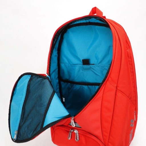 Główna komora jest podzielona dodatkowymi schowkami . Oddzielna i wentylowana komora na buty w dolnej części. Boczny uchwyt na butelkę. Z tyłu kieszeń na 2 rakiety. Cecha szczególna: rączki rakiety można chronić przed warunkami atmosferycznymi za pomocą osłony ochronnej.