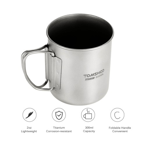 Kubek wodny TOMSHOO jest wykonany z odpornego na korozję materiału tytanowego, lekkiego i trwałego w użyciu. Ma pojemność 300 ml, doskonale nadaje się do użytku domowego i na zewnątrz, takich jak camping, turystyka, plecak, itp.