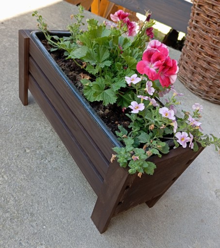 Starannie wykonana drewniana skrzynka na kwiaty.