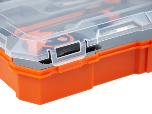 Cały zestaw zapakowany jest w praktyczny i solidny organizer wykonany z wytrzymałego tworzywa sztucznego. Pudełko umożliwia bezproblemowy transport zestawu oraz zapewnia porządek w miejscu pracy.