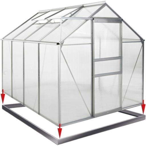 W zestawie stalowa rama fundamentowa ułatwiająca montaż na wcześniej przygotowanym podłożu betonowym (bloczki betonowe, kostka, płyty betonowe), która jest odpowiednia do szklarni o wymiarach 250 x 190 cm. Rama jest przymocowana do fundamentu za pomocą metalowych haczyków. Szklarnia i rama są mocno połączone ze sobą za pomocą kątowników i śrub.