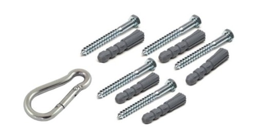 W zestawie z mocowaniem otrzymasz zestaw wytrzymałych kołków rozporowych oraz mocny karabińczyk 8mm.