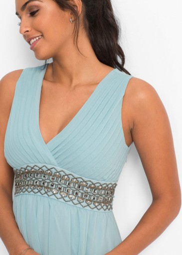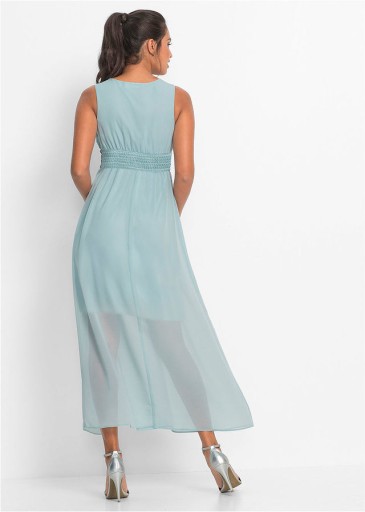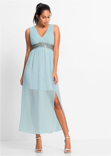 Długa sukienka wieczorowa z szyfonu z efektowną aplikacją pod biustem. Dekolt z założeniem kopertowym. Z tyłu przeszycie cienkimi gumkami. Miękko układająca się część spódnicowa, na podszewce w długości do kolan, z rozporkiem z lewej strony. Dł. w rozm. 38 ok. 136 cm.