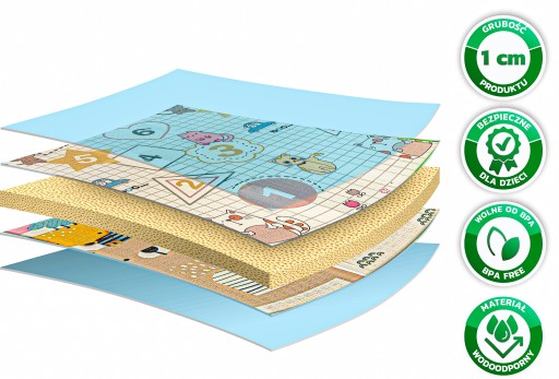 Wykonana z najwyższej jakości pianki XPE o grubości 1 cm, maty nie tylko zapewniają bezpieczeństwo, ale także izolację termiczną od podłoża. Nie zawierają szkodliwych substancji takich jak BPA, PVC czy ftalanów, co sprawia, że są bezpieczne dla zdrowia dzieci. Dodatkowo, ich wodoodporna powłoka chroni przed zabrudzeniem i wilgocią.