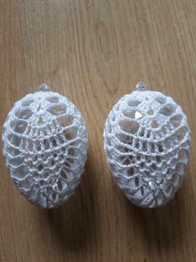 Oferuję Państwu jajka szydełkowe robione ręcznie na wypełnieniu akrylowym. Wielkość 8 cm. Wykonane kordonkiem bawełnianym w kolorze białym. Mogą być ozdobą wielkanocną w koszykach lub zawieszką. Cena 1 szt. 16 zł.