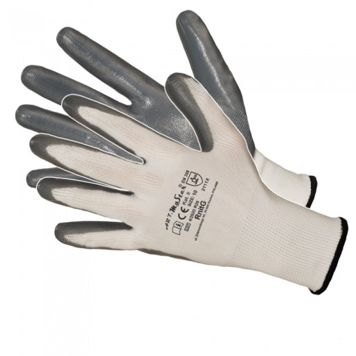 Rękawice ochronne, wykonane z dzianiny poliestrowej w kolorze białym, powlekane nitrylem w kolorze szarym, bezszwowe, zakończone ściągaczem.