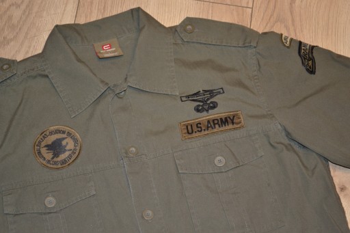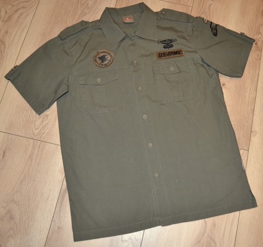 MODNA KOSZULA MĘSKA W STYLU WOJSKOWYM, KOLOR KHAKI, ZAPINANA NA SYGNOWANE GUZIKI, LOGOWANA I OPISANA, 100% BAWEŁNA, 100% ORYGINAŁ, NOWA KOLEKCJA.