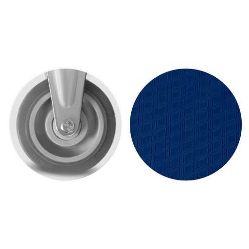 - Wózek posiada 2 w pełni obrotowe koła gumowane z metalowym wzmocnieniem, co pozwala na sprawne i precyzyjne manewrowanie wózkiem.
