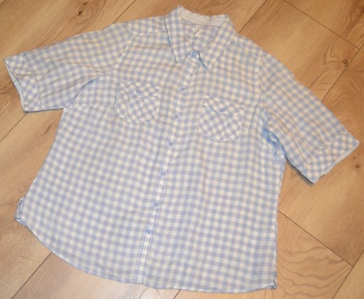 MODNA DAMSKA KOSZULA W NIEBIESKO-BIAŁĄ KRATKĘ, KIESZENIE PO OBU STRONACH, 100% LEN, 100% ORYGINAŁ.