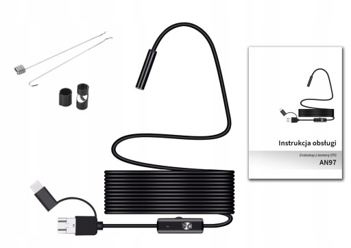 - Kamerę endoskopową USB OTG na przewodzie typu HARD o długości 5m wraz z trzema typami USB (USB / microUSB / USB-C)