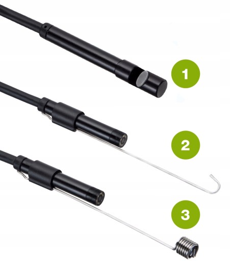 Dodatkowe elementy rozszerzą funkcjonalność kamery - magnes czy lusterko idealnie sprawdzą się w trudno dostępnych miejscach, jeżeli magnes nie wystarczy zawsze możemy posłużyć się nakrętką w formie haczyka.