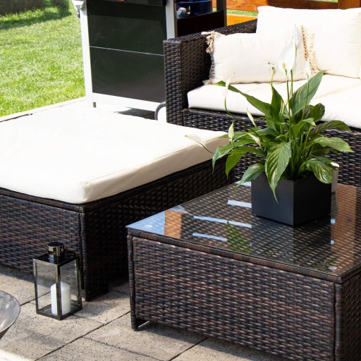 - Materiał: technorattan, ciemne szkło hartowane, poliester/pianka PP