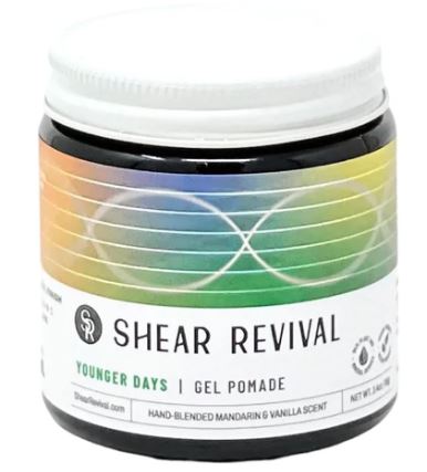 Żelowa pasta do włosów Younger Days Gel Pomade od amerykańskiej manufaktury Shear Revival, stworzona w we własnym laboratorium, gdzie każdy produkt wytwarzany jest ręcznie w małych partiach z produktów najwyższej jakości. Younger Days to inne podejście do żelowej pomady w stylu „traditional barbershop style”. Używając wyłącznie roślinnych i wegańskich składników, stworzono przezroczystą żelową pomadę o średnim chwycie, która spłukuje się samą wodą. W składzie znajdziemy masło z aloesu i mango, aby zachować zdrowie włosów i skóry głowy, jednocześnie stosując wosk Candelilla, aby zapewnić trwałe utrwalenie. Posiada całkowicie naturalny zapach mandarynki i wanilii stworzony z olejków eterycznych klasy terapeutycznej. Żelowa pomada idealnie sprawdzi się w klaszycznych fryzurach zaczesanych plecami i nowoczesnych pompadourach (combable).