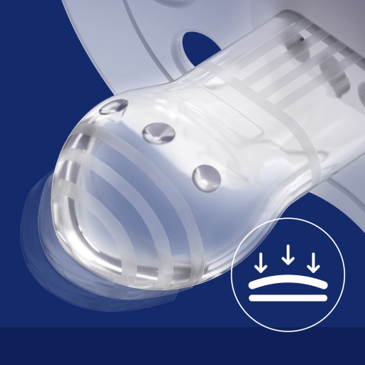 Dynamiczny smoczek, dzięki unikalnej budowie z silikonu o różnej grubości, rozciąga się i kurczy zgodnie z rytmem ssania dziecka. Dzięki temu chroni jego odruch ssania i nie ma niekorzystnego wpływu na karmienie piersią. Gumka ma symetryczny kształt inspirowany kształtem brodawki sutkowej wypełnionej mlekiem, co zapewnia dziecku znajome odczucia podobne jak przy piersi.
