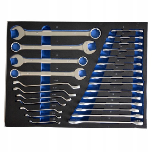 - Zestaw 19 szt. kluczy płaskich: 8/9/10/11/12/13/14/15/16/17/18/19/20/21/22/24/25/27/30 mm