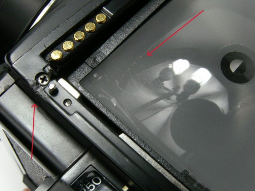 Jedyny mankament - posiada pękniętą ramkę górną - trzy pęknięcia przy dwóch śrubach oraz mikroskopijne od przodu. Niestety Bronica by zaoszczędzić na wadze w przeciwieństwie do ETR - gdzie były one metalowe - w modelach ETRS i ETRSi wprowadziła ramki plastikowe i niestety te pęknięcia zdarzają się dość często. Zostały one dość solidnie sklejone klejem epoksydowym i nie mają ŻADNEGO wpływu na funkcjonalność (aspekt czysto kosmetyczny!) - styki pracują idealnie (testowane z doma różnymi pryzmatami!), a kominek/pryzmaty trzymają się bardzo solidnie.