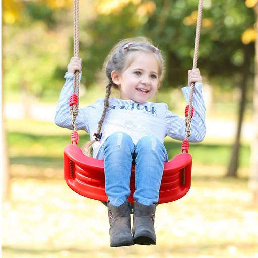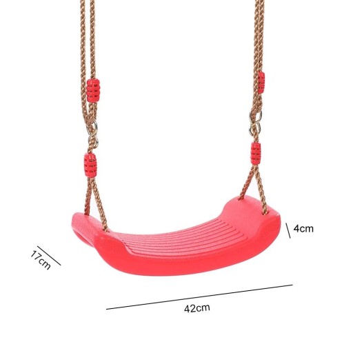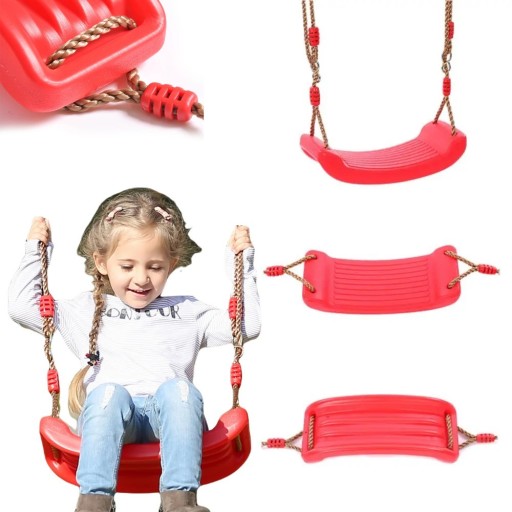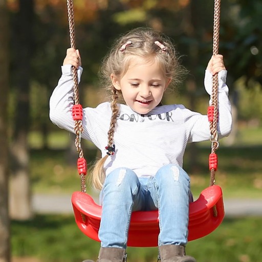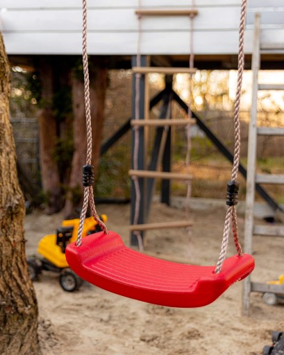 Huśtawka na linie została wykonana w intensywnym czerwonym kolorze, który jest uniwersalny i atrakcyjny dla wszystkich grup wiekowych.