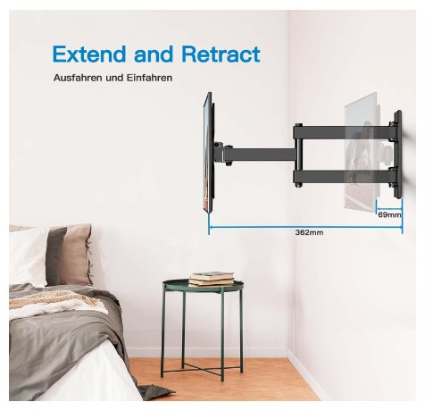 - Oszczędność miejsca – przegubowy uchwyt ścienny do telewizora z ramieniem, który odciąga 5 cm od ściany, a także rozciąga się do maksymalnie 35,5 cm od ściany, oszczędzając cenną przestrzeń i dodając ładny, schludny wygląd do Twojego domu.